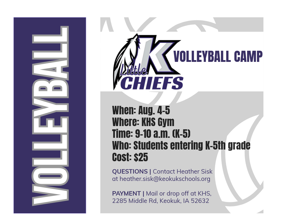 The Keokuk High School is hosting a Chiefs Volleyball Camp and Little Chiefs Volleyball Camp this summer. At each camp based on grade level, students will receive instruction on developing and working on the fundamental skills of the game. They will also learn the importance of good sportsmanship and teamwork.